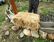 まずはストローベイルハウスを造る練習として、材料がよく似た古畳で「TATAMI HOUSE」を作りました。解体した古民家の厚い畳の廃材利用で、畳を壁材に土を塗り固めた小さな家です。