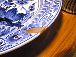 一部に金が塗られているお皿ですが、これは割れてしまったり欠けてしまったりした陶器のお皿を漆と本金を使って修理する「金継ぎ」と呼ばれる昔ながらの修理方法だそうです。