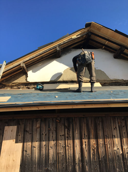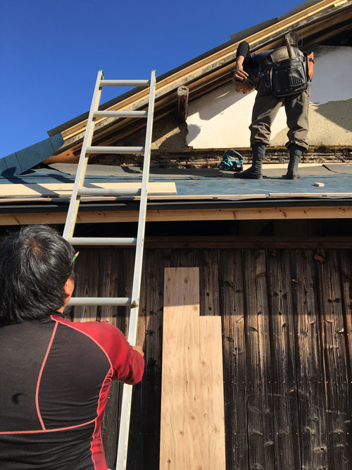 軒上では大工さんが上で寸法を測り、