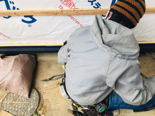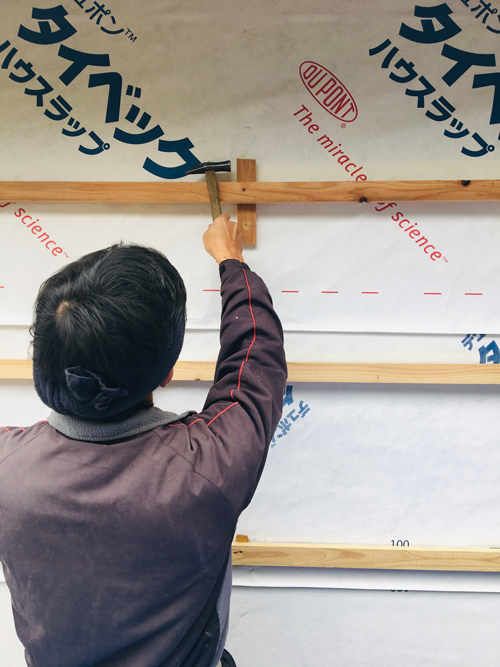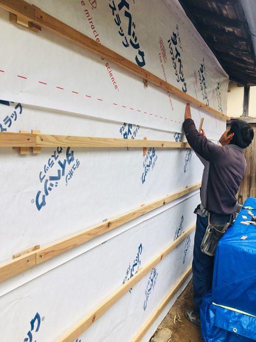 外壁下地の防水シートで家全体を覆いつくしています。