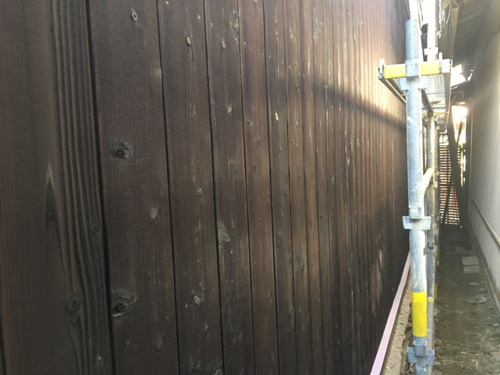 とにかく隣地が近いので大工(平岩さん)も建物と建物の隙間を何度も往復。