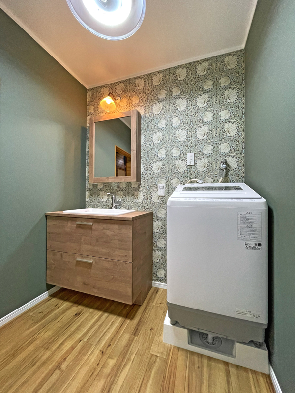 洗面室のクロスは、奥様が選ばれた「ウイリアムモリス」のデザイン柄。