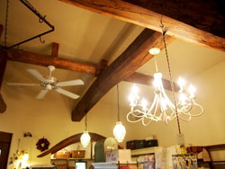 天井に立派な梁が走る、重厚な佇まいのお店は、解体された古民家の古材を再利用して建てられたそうです。”太い古材の梁”や、漆喰の壁をやわらかく照らす”アンティークの照明の光”、、見ていると、懐かしいような、あたたかな気持ちに、、。オーナーさんの古いものを、大切に慈しむ気持ちが伝わってくるよう。空間の心地良さも魅力のひとつ。