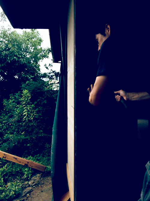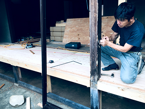 縁側のサッシの取付に伴う調整を行っていました。