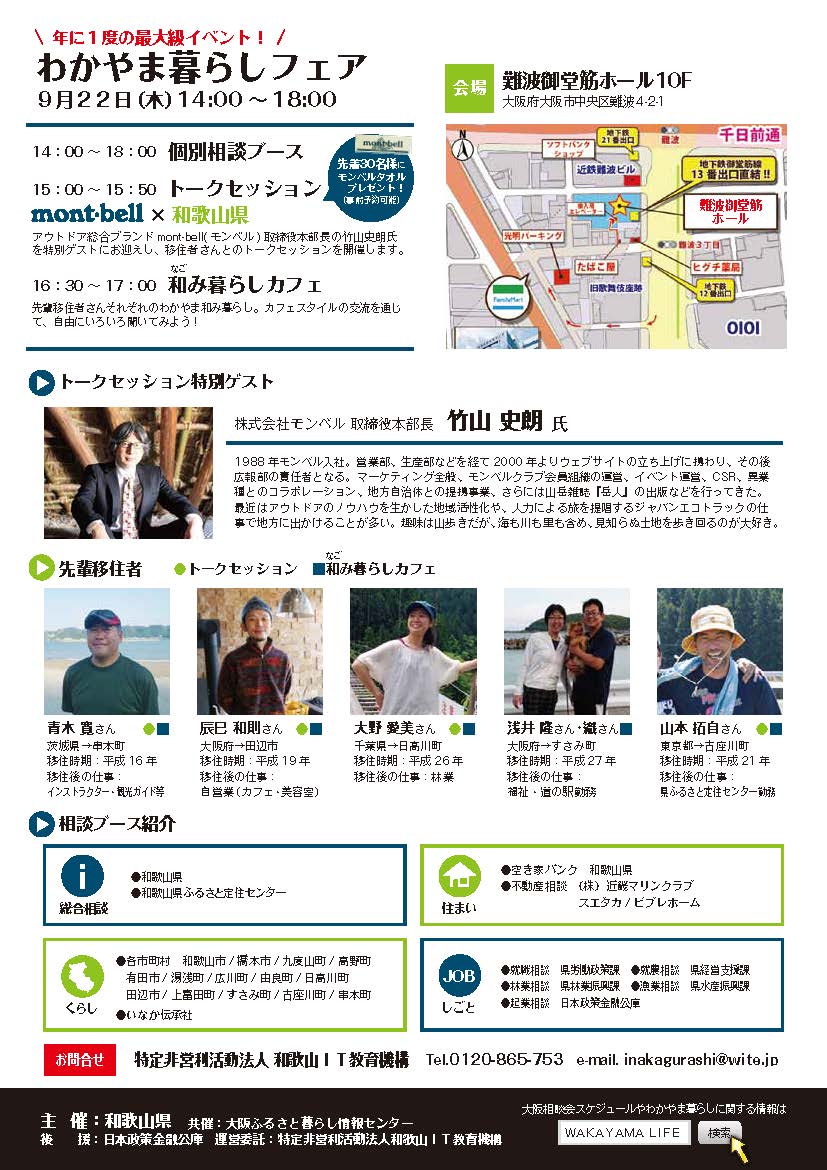 2016.09.11 9/22(木) わかやま暮らしフェアーが開催されます! イベント 毎年恒例の和歌山県主催の「わかやま暮らしフェア」が開催されます。 和歌山県の移住に熱心な市町村も参加しますので、興味のある地域のことが直接聞けます。弊社もブースを設営しますので、ぜひお立ち寄り下さいませ。 詳細はチラシをご覧下さい。 日時:平成28年9月22日(木) 14:00~18:00 場所:難波御堂筋ホール 大阪市中央区難波42-1
